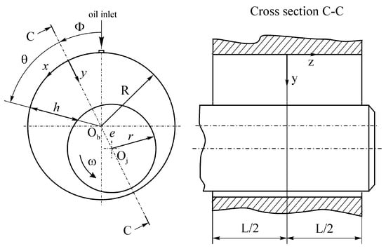 In a bearing bush with the length and the radius , a journal of the radius performs rotational movement with the constant angular velocity under hydrodynamic lubrication conditions, as shown in Figure 1.