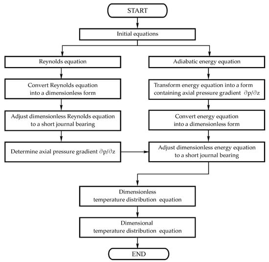 The dimensionless parameter , defined in the Equation (4), is called the slenderness ratio and is the criterion for estimating the length of the journal bearing. If it is greater than 2, then the bearing is long, and if it is less than 1, the bearing is short [23,24]. As most journal bearings in engineering applications belong to short bearings, the focus will be directed to such bearings only. In the case of a short bearing, the circumferential pressure gradient can be neglected in comparison with the axial pressure gradient. This assumption enables the coupled Equations (5) and (6) to be solved for a short bearing, in order to determine the temperature field in the bearing oil film.