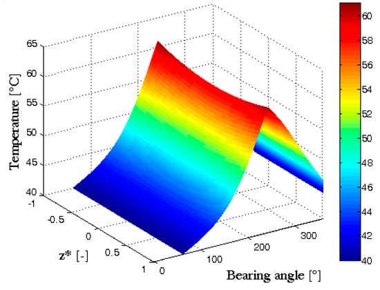 A more complete view of temperature distribution in the oil film of the bearing is enabled by a 3D-diagram showing the temperature change along both the bearing circumference and length. Such a diagram for the bearing considered at = 4000 rpm and = 6000 N, is shown in Figure 5. It is noted that the temperature variation along the axis of the bearing has a slightly parabolic shape that is symmetrical in relation to the bearing midplane (). Furthermore, the temperature decreases from the side planes to the midplane of the bearing. A similar temperature distribution was obtained experimentally by Mitsui et al. [26].