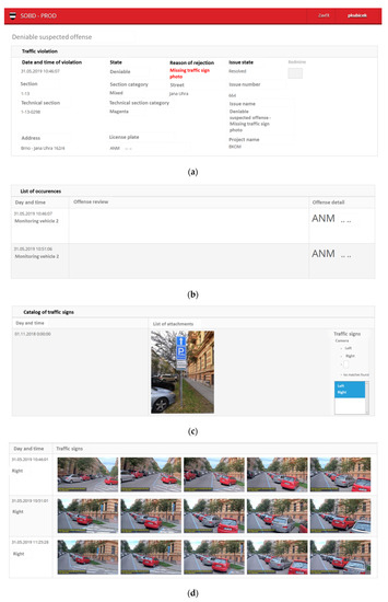 In Figure 9a–e is an example of the output of the web documentation of suspected offenses against residential parking generated from the SOBD system for the municipal police. Some data are anonymized for privacy reasons (GDPR). The key part is the photo documentation (Figure 9d) and text with image analysis of the identified license plate (Figure 9b) of the vehicle during the first and second passage. The Municipal Police can choose from more photographs than the specified ones to be included in the offense report. It has a similar structure to this document, but is supplemented by vehicle data obtained from the vehicle register and its owner and specification of the legal provision of the offense. This protocol shall be sent to the owner of the vehicle through the competent authority.