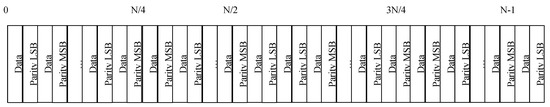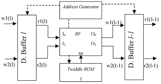 In Equations (28)–(30), % is the modulo operator, is the floor function, and Cnt is the current value of the counter in the Address Generator. The stages of the developed FFT operate in a ping-pong manner. For example, in the first N/2 clock cycles the FFT inputs are loaded on the input Buffer at stage l=logN-1. In the next N/2 cycles, the butterfly of stage l is driving its outputs to Buffer l-1. Then in the next N/2 cycles, the stage l-1 is reading inputs from Buffer l-1 and driving the outputs to the Buffer l -2. At the same time the input Buffer l can be loaded with the next set of FFT inputs. The FFT latency is cycles and the throughput is an FFT output completed every N cycles.