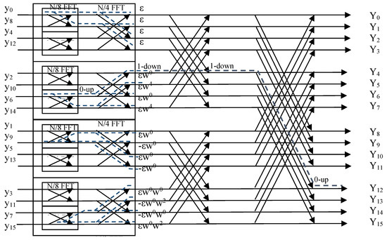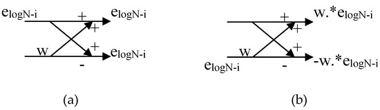 In the four propagation cases examined, a single error is caused by a QAM symbol that does not have the expected trivial value (they differ by ε) in order to generate FFT outputs equal to zero (that can be pruned) or the expected trivial intermediate butterfly outputs. Instead, let us assume that: . The propagation of the error in the first two levels of butterflies (a pair of 2-point and one 4-point FFT) is denoted with the dashed lines in Figure 2. In the first case, the error ε appears at the even input i of the 2-point FFT at the top. Τhe error at the outputs of the 4-point FFT is . In the second case that appears from top to the bottom of Figure 2, the non-trivial yi symbol appears at the even input i+2 of the four-point FFT. The error in this case is . In the third case the error appears at the odd input i+1: . In the last case at the bottom of Figure 2, the error at the odd input i+3 is . In the previous expressions of elogN-1 the twiddle factors are used without the index N for simplicity. The differences in the four elogN-1 expressions are owed to the different twiddle factors that multiply the error ε as it propagates through different paths. Figure 3 shows how the elogN-I error of stage logN-p propagates to the next butterfly stage logN-(p-1). The arrows in Figure 3 are buses and Figure 3a shows the propagation of the error from the top butterfly input, while Figure 3b shows the propagation of the error from the bottom input. In the first case while in the latter case . The symbol “.*” implies multiplication of the corresponding elements of the vectors and w is the vector of all the twiddles of a specific butterfly stage. If multiple errors exist in the FFT inputs, their effect is added at the FFT output. For example, if the errors ε3 and ε7 occur in the bit reversed 16-point DIT FFT inputs y3 and y7 (corresponding to Y12 and Y14 outputs), the individual output errors ( and , respectively) would be: