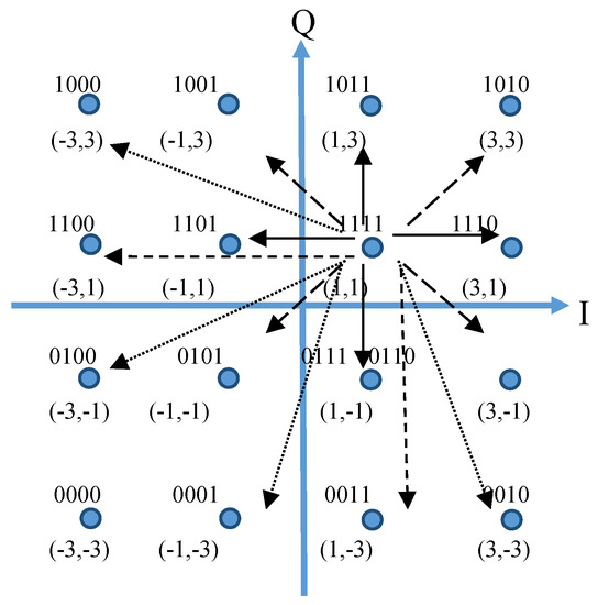 The combined output error if both ε3 and ε7 occur is . Of course, the same error propagation model holds for the IFFT on the transmitter side. Moreover, the estimation of the error ε is easier on the transmitter side since, the IFFT inputs are QAM symbols with integer values. The 16-QAM constellation shown in Figure 4 is used as a case study, and we assume that Xc = ”1111”, i.e., the trivial input is ‘1’. We can see that there are: a) N(2) = 4 neighboring QAM symbols (X(2)) that differ by 2 in the real or imaginary direction from Xc (the continuous arrows), b) N(2,2) = 4 symbols (X(2,2)) that differ by 2 in each direction from Xc (dashed arrows with big dashes), c) N(2,4) = 4 symbols (X(2,4)) that differ by 2 in one direction and by 4 in the other from Xc (dotted arrows), d) N(4) = 2 symbols (X(4)) that differ by 4 in either the imaginary or real direction from Xc (dashed arrows with small dashes), and e) a single (N(4,4) = 1) symbol (X(4,4)) that differs from Xc by 4 in each direction. X(2) symbols correspond to 4 input bits with one ‘0’ while X(2,2) and X(4) symbols are derived from 4 input bits with 2 zeros. Finally, the X(2,4) symbols correspond to 4 input bits with 3 zeros and the QAM symbol (-3,-3) is derived by “0000”. The corresponding probability of each symbol is pc, p(2), p(2,2), p(4), p(2,4), p(4,4). The order of these probabilities is pc > p(2) > p(2,2) = p(4) > p(2,4) > p(4,4) due to data sparseness.