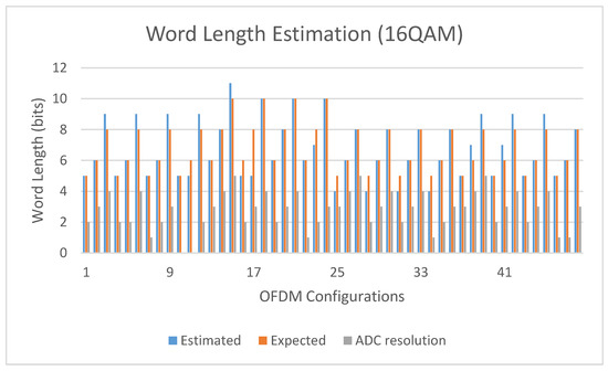 Estimated, expected word length and minimum ADC resolution for all the 16QAM OFDM configurations tested.