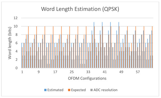 Estimated, expected word length and minimum ADC resolution for all the QPSK OFDM configurations tested.