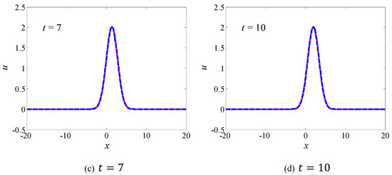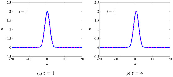 where the speed takes . We can use the multi-symplectic centered box scheme (Equation (9)) to simulate the evolution of the Gaussian solitary wave in the domain . The time step length takes and the spatial resolution is .