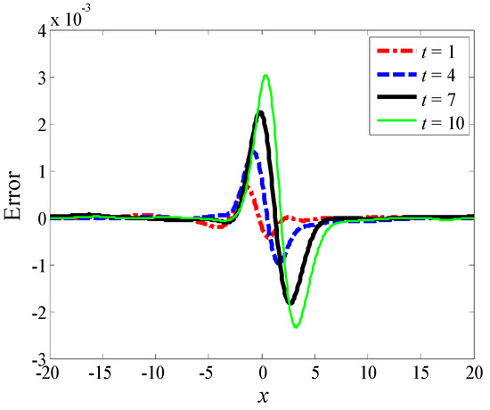 Figure 3 shows the errors between the numerical and analytical solution at , 4, 7 and 10. It can be found from Figure 3 that the scheme (Equation (9)) can simulate the traveling Gaussian soliton with small errors. The maximum errors mainly appear at the locations near the soliton core.