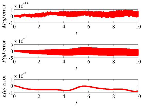 Considering the integral values of the initial conditions as the initial values of the conserved quantities in Equation (13), the numerical absolute errors of the conserved quantities in each time step can be obtained, which are the difference between the numerical results and the initial values.