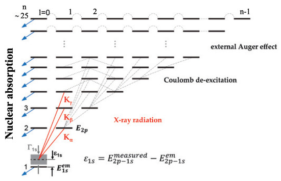 After formation, the kaonic atom undergoes a de-excitation processes until it reaches the ground state, at which it interacts with the nucleus also via the strong interaction. During the transitions to the ground state, X-ray radiation is emitted (see Figure 2).