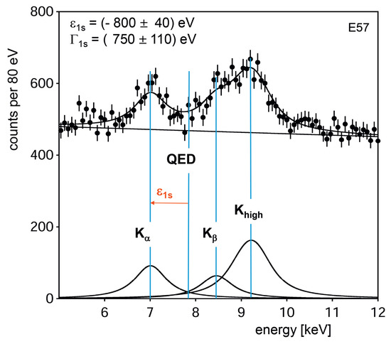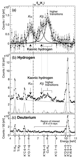 A simultaneous global fit of the hydrogen and deuterium spectra was performed, and details are given in [28]. Figure 3a shows the measured X-ray kaonic hydrogen spectrum after the subtraction of fitted background. X-rays of kaonic hydrogen were observed. Figure 3b,c shows details of the fit results.