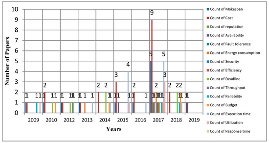 Table 6. QoS parameters of the reviewed PSO meta-heuristic algorithms for workflow scheduling.