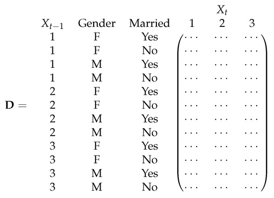 To consider the interaction between the modalities assumed by categorical covariates and the states of the model, we have two main alternatives: either a single, but possibly very large, transition matrix; or an approximation inspired from the Mixture Transition Distribution (MTD) model. In the former case, we create a single transition matrix with a row for each combination of the values taken by the covariates and the lag of the variable. Here, we denote this matrix by D. Then, the model will estimate, simultaneously, separate models for each distinctive value of the covariate by simply counting the number of observed transitions for each modality of the covariate. This approach is similar to how covariates are handled in nonparametric Kaplan–Meier estimation of survival curves, where separate curves are fitted for each value of the covariate. An example of a single transition matrix for a Markov chain with 3 states and two binary covariates (e.g., “gender” and “be married”) is reported in Figure 1. This approach is quite easy to use, but the size of the resulting matrix can easily explode involving too large a number of parameters. For instance, with just three states and two dichotomous covariates, the number of rows is for a total number of free parameters to estimate equal to 24.