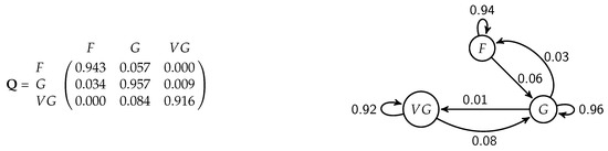 The first hidden state is mainly associated with state M (65%) (average health) and with a worse health condition (10% of probability of feeling B “not very well” or P “not well at all”). We will then label this state as a "frail" health condition (F). The third hidden state refers to individuals in good health with high chances to be in excellent condition (56.1%). We will refer to this hidden state as a situation of “very good” condition (). Finally, the second state is an intermediate situation mainly associated with W (84%) or M (almost 10%). We will refer to it as a state of “good” health (G). We will then (re)label the hidden states as F, G, and . Here, the labels of the hidden states will be printed in italics since such states are not observed but inferred from the data. The transition probabilities between hidden states can be represented in matrix form (Figure 2 left panel) or, since we have a relatively low number of hidden states (the latent variable has three categories in our example), as a path diagram (Figure 2, right hand side). In the diagram, the arrows corresponding to probabilities estimated as zero are not shown, and for readability purposes, transition probabilities have been rounded to two decimals.