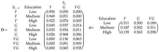 Let us consider now the effect of education directly at the visible level using the MTD-based approach. As before, at the hidden level we have a latent variable with three states that we will keep referring to as F, G, and . For each hidden state, the model estimates a mixture of the response probability distribution of that hidden state and the distribution of the visible SRH given the level of education. In addition, a vector of weighting parameters will be estimated to measure the relevance of the explanatory factor for each hidden state. The results of our illustrative example are reported in Table 6.