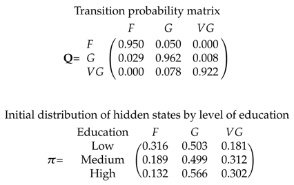 The weight parameters show that educational levels affect the SRH condition only for those who are in the “fair” (F) hidden state (associated weight of 0.5451); also for them, the level of education is slightly more important to predict the current condition than the SRH itself (54.51% compared to 45.49%). For the other two hidden states, the education level has an almost null weight (0.004 for the second hidden state and 0.000 for the third hidden state). Due to the low impact of education on the data generating process, comparing the model with (Table 6) and without (Section 4.2) covariate, the initial distribution and the transition matrix of the model with and without covariate remain similar.