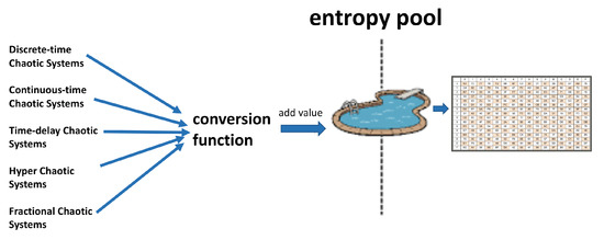 Chaos theory offers researchers various opportunities in many areas of science [8]. The rich dynamics that it contains have always made chaotic systems a popular research area. In addition to its use in modeling and control areas, its random behavior has led cryptography experts to focus on this field [9]. The basic idea behind this interest is that confusion and diffusion requirements can be met with the principle of sensitive dependence on initial conditions and control parameters. Confusion and diffusion requirements are two important properties of encryption protocols. These requirements were identified by Claude Shannon in 1945. “Confusion makes it difficult to find the key from the ciphertext and if a single bit in a key is changed, most or all the bits in the ciphertext will be affected. Diffusion means that if we change a single bit of the plaintext, then (statistically) half of the bits in the ciphertext should change”. It has been suggested that these requirements can be met using chaotic systems, since chaotic outputs are extremely sensitive to changes in initial conditions and control parameters, and have a nonlinear characteristic. Researchers have used chaotic systems as an entropy source in cryptographic designs. They used the initial condition and control parameters of chaotic systems as the secret key of cryptographic protocols. It has been suggested that different entropy sources can be produced by using different initial conditions and control parameters, as they will produce different outputs with small changes that may occur in the initial conditions and control parameters. Many cryptographic protocols such as image encryption algorithms [10,11], key generators [12,13] and s-box designs [14] have been proposed using this design idea, as visualized in Figure 1.