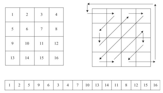 Block encryption algorithms are ineffective in the encryption of digital images. One of the most important reasons for this problem is the high correlation between the pixel values of an image [38]. Usually, images are represented by a matrix with a size of . The values of and indicate the values of the row and column, respectively. One of the proposed approaches to solving the correlation problem is to reposition the matrix cells using the zigzag transformation method, as shown in Figure 2. In this study, we propose the use of the zigzag reading approach as a postprocessing technique.