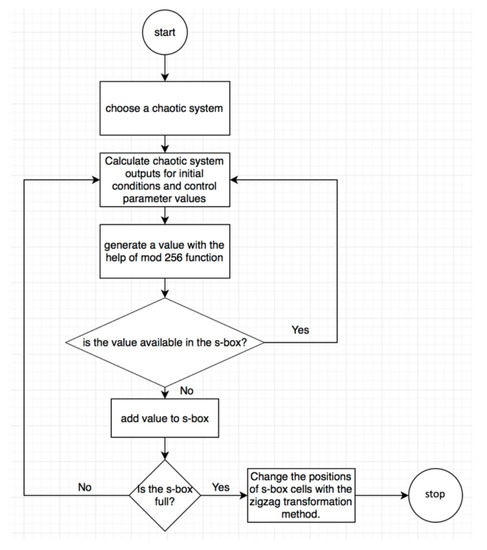 Since AES-like s-box designs comprise a matrix with a size of 16 × 16, the zigzag transformation approach can be easily performed. The flowchart of the proposed method is given in Figure 3. The operation of the algorithm is given step by step below. Also, the pseudo code is expressed in Table 1 for the logistic map.