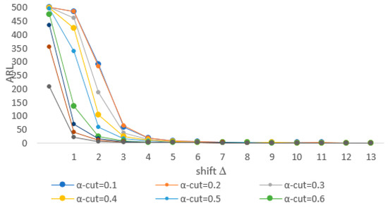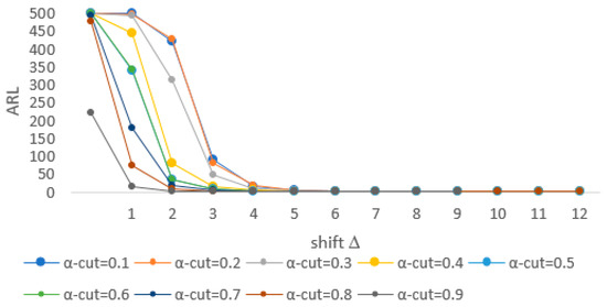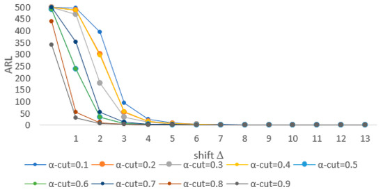 Table 2 first block presents the ARL values for the FBP control chart for the first scheme. ARL0 is the expected number of samples until finding the first out-of-control sample, given that the process is in control. By applying from 0.1 to 0.8, an ARL0 of around 500 is obtained, and the value of ARL0 is lower than 300 for equal to 0.9. In the other hand, for the highest value of the value of ARL0 is 220, meaning that the false alarm rate is high. With higher values of , the value of ARL0 decreases.