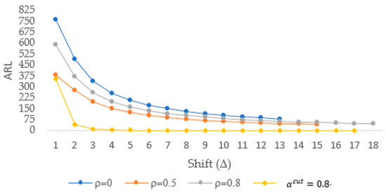 Table 2 third block and Figure 4 provide the ARL values for the third scheme (the scheme with a higher coefficient of correlation). In this scheme, data with equal to 0.8 are generated. Among all the ARL plots, the value of ARL0 is around 500 for an equal 0.1 to 0.5. In this scheme, the proposed control chart with an value equal to 0.8 has a value of ARL0 closer to 350. However, with an smaller than 0.6, the chart has a higher value of ARL0 (closer to 500). However, when is equal to 0.9, the value of ARL0 is equal to 206, which indicates a high false alarm rate. Briefly, based on Figure 4, the ARL for the proposed chart drops sharply. For the fifth level shift of the parameters, the value of ARL1 is nearly 135. The proposed chart using an equal to 0.8 gives better performance than the other charts. In general, based on the results of the three schemes, the proposed chart provides the best performance when the correlation coefficient of the quality characteristics is higher.