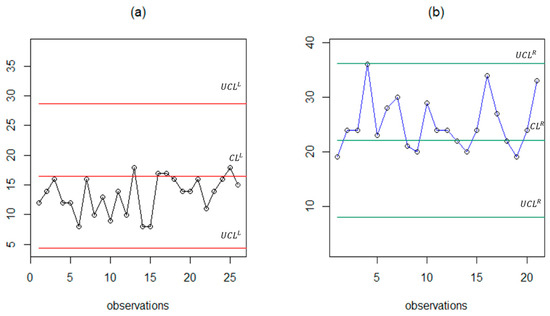 FBP chart for monitoring the bottle production data: (a) FBP left side chart, (b) FBP right side chart.