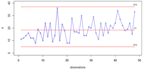In practice, during the production of a bottle, a crack under the ring will cause a crack on the ring. There are 48 observations used, where each observation contains 192 bottles. First, to estimate the fuzzy parameter, the number of defects in each observation is calculated. Thereafter, each observation is formed into triangular fuzzy numbers using the FBP procedures outlined in Section 3.2. The monitoring result for equal to 0.8 is shown in Figure 6.