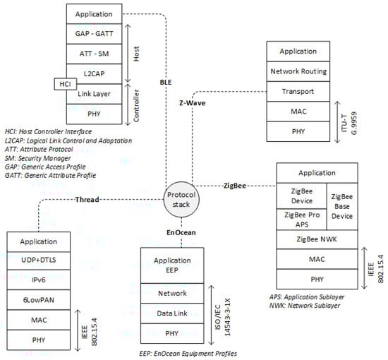 EnOcean technology invented by the homonymous company and patronized by the EnOcean Alliance is optimized for ultra-low power wireless battery-less “install and forget” devices and energy harvesting applications in building and home automation, and is standardized in ISO/IEC 14543-3-10 [28]. To achieve the aforementioned goals, the EnOcean’s radio protocol (ERP) uses sub-GHz frequency bands, namely 315, 868.3, 902, and 928 MHz, depending on the legal regulations applying to each country. In addition, battery-less solutions exist employing the 2.4 GHz ISM band (IEEE 802.15.4) for enabling integration with ZigBee and BLE systems. The typical transmission range of the technology covers distances of up to 30 m in buildings and up to 100 m with line-of-sight, while the theoretical maximum data rate is 125 kbit/s. EnOcean supports the mesh network topology, where all nodes can communicate point-to-point with each other in their wireless range. EnOcean devices can also communicate with other networking realms, including TCP/IP-based, via the use of a gateway. The three lower layers of the EnOcean protocol stack are realized by means of the ISO/IEC 14543-3-1X standard, while the Alliance offers the EnOcean Equipment Profiles (EEP) application sub-layer for supporting interoperability across diverse vendors and products under this standard [29].