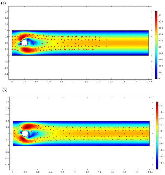 Velocity magnitude and particle distribution for lower frequency at (a) t = 14 (s) and (b) t = 27 (s).
