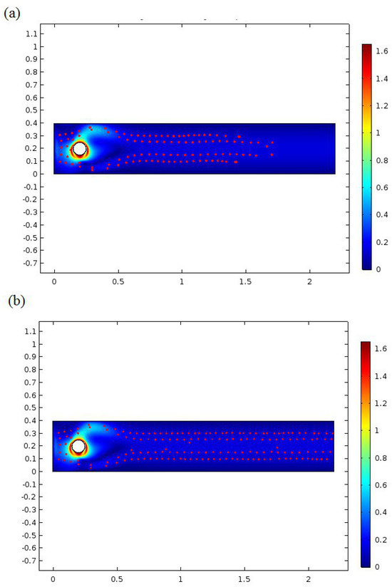 Velocity magnitude and particle distribution for higher frequency at (a) t = 14 (s) and (b) t = 27 (s).