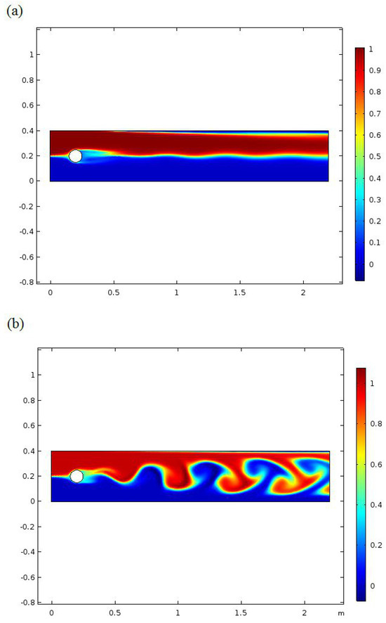 Particle concentration at (a) t = 3(s) and (b) t = 7 (s).