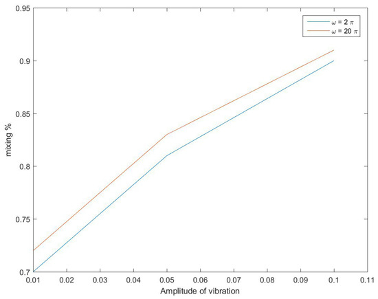 Particle concentration at t = 3 (s) and t = 7 (s) is shown in Figure 6. Notwithstanding the stream unsettling influences, the blending effectiveness upgrade is also an outcome from the nearness of roundabout impediments in the blending channel. The round impediments alter the stream heading. That heading converts the circulation arrangement, improving the blending proficiency. The vortex age in the galloping is the reliant speed. In the primary distinction, galloping configuration age as of now begins at t = 7, as shown in Figure 6. As seen in Figure 7, the mixing performance of the system is studied as a function of amplitude of vibration and natural frequency of the galloping. Figure 7 shows the index of mixing for a galloping micromixer under various conditions. As shown, the galloping micromixer presents a higher mixing index than the vortex micromixer. To look at and dissect the blending productivity of the galloping micromixers, we establish their blending effectiveness using reproduction examination. Figure 7 shows the consequences of the blending effectiveness of two Koch fractal bewilders, distinctive redirection points, and various separations of contiguous two frequencies at an amplitude of 0.01, 0.5, and 0.1. As shown by the increase of amplitude and frequency of the galloping motion, the mixing index is increased.