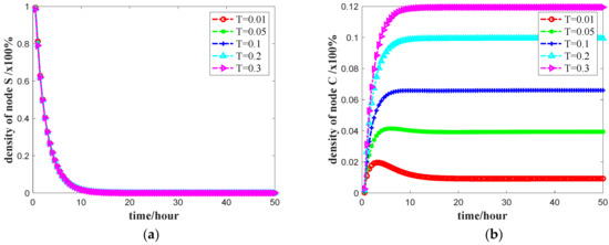 To analyze the effect of the reinforcement effect on network propagation, that is, the impact of the transformation from the immune state R to the hesitant state C on the propagation of public opinion, we observed its impact on each state node by changing the upper limit T of the propagation probability in the medium. Assume that the node with the highest degree of selection in the initial state is the propagation state I [44,45], and the other node states are all unknown state S. Set the initial parameters PCR = 0.2, PSC = 0.7, PCI = 0.5, PIR = 0.2, PSI = 0.2, PSR = 0.1, , and b = 10. The influence of different values of the upper limit T of the propagation probability on the density of various nodes is shown in Figure 4.