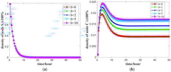 To analyze the impact of the negative social reinforcement effect factor b on the density of various nodes, set b = 0, b = –1, b = –2, b = –5, and b = –10 and perform 100 iterations based on the basic parameters. The simulation results are shown in Figure 6.