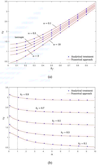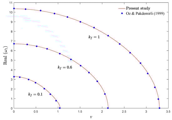 To examine the correctness of the present solution, the real part of the fundamental frequency of an isotropic moving EB simply supported beam under a compressive load versus dimensionless axial velocity is plotted in Figure 2 for various values of flexural stiffness. As revealed in this figure, the results of the current investigation are in good agreement with those presented by Oz and Pakdemirli []. According to Figure 2, by increasing kf, the fundamental frequency of the isotropic system rises.