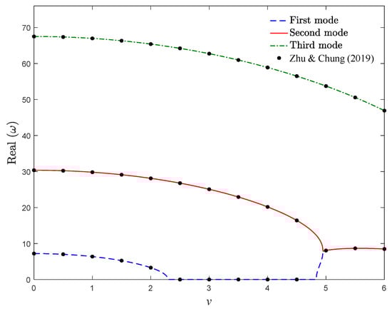In Figure 3, the real part of the three vibrational frequencies of isotropic moving simply supported Rayleigh beam under tension load is displayed. The obtained outcomes are in a close agreement with the results obtained by Chang et al. []. It should be noted that, to obtain the presented results in Figure 2 and Figure 3, nine terms in Equation (16) are considered. To this end, due to the accuracy of the acquired results, applying nine vibrational bending modes is reasonable for the subsequent computations.