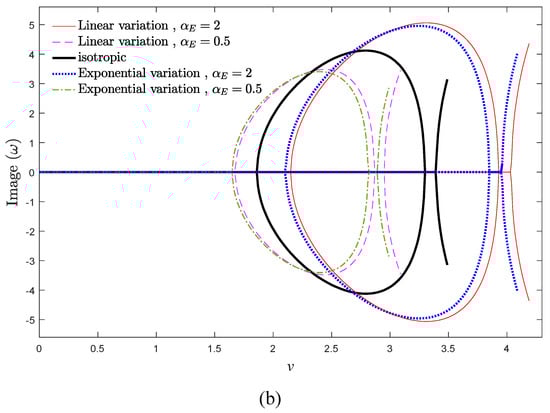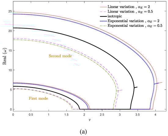 According to Figure 4a, the real part of system frequencies ascends by increasing the elastic modulus gradient parameter, especially frequencies of the higher modes. Additionally, increasing αE leads to ascending the critical divergence and flutter velocities of axially AFG moving EB beams. In other words, it is feasible to hinder the occurrence of undesirable divergence phenomenon by increasing the elastic modulus gradient in moving structures. Since αE has an increasing role in the stiffness matrix; hence, any increment in αE leads to a stiffer system and also wider stability regions. In other words, increasing αE induces the stiffness-hardening effect in the system. Another important feature in Figure 4a,b is that the velocity bandwidth corresponding to the divergence and flutter phenomena in the system (vd < v < vf) would be expanded slightly by increasing αE. Moreover, based on these figures, compared with the exponential variation of elastic modulus, the linear variation leads to a more stable system. As demonstrated in Figure 4b, the damping ratio of the system is higher for αE > 1 and linear variation of elastic modulus. Accordingly, it is possible to determine the instability thresholds and vibrational behavior of the system by fine-tuning of the elastic modulus gradient parameter.