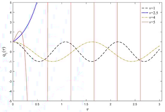 To better understand the dynamic behavior of the considered structure, the time history of the first generalized coordinate of the system in various velocities are displayed in Figure 5 for kf = 0.5, β = 0, αρ = 1, and αE = 2. Unit static displacement and zero initial velocity for the first mode ( and ) are considered for the initial conditions of the system. According to Figure 4a, for v = 1, Real(ω) > 0 and Image(ω) = 0; hence, the system is dynamically stable and generates stable harmonic oscillations. By increasing v, the effective stiffness of the system declines due to the centrifugal force effects. For v = 2.5, the real part of the fundamental frequency of the considered system equals zero, and the beam undergoes instability. In this condition, the dynamic response of the system dramatically grows without oscillation, and the static instability occurs in the system. Increasing the velocity to v = 4 leads to vanishing the imaginary part of frequency, and the beam regains its stability. As the velocity increases, when v = 5, the real part of the frequency grows, while the imaginary part of the vibrational frequency becomes zero. As a result, the oscillation amplitude of the system amplified exponentially by the time. In this case, unlike the divergence instability, the AFG moving beam experiences the flutter instability with growing oscillation. Therefore, the flutter instability is more dangerous than the divergence instability for axially moving structures.