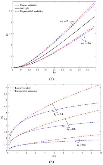 According to Figure 6b, compared with the conventional isotropic axially moving beam (αE = 1), the AFG system is more stable when αE > 1 and ascending αE promotes the stability of the system. It is evident that the critical divergence velocity of the system increases by kf, which can be attributed to the stabilizing effects of the flexural stiffness. By approaching the value of elastic modulus gradient parameter to one (isotropic condition), the stability boundaries of the system are close to each other for linear and exponential distributions, and these boundaries separate from each other by increasing or decreasing of αE. Additionally, except at αE = 1, the system is more stable for the linear distribution of elastic modulus in comparison with the exponential one.