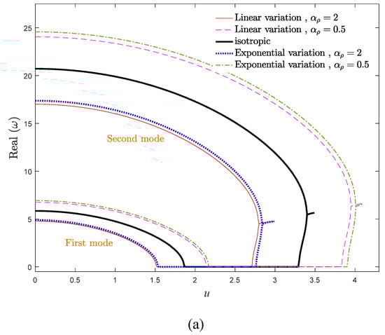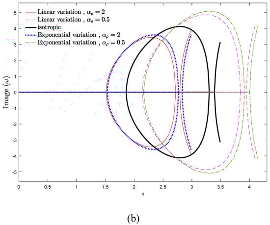 To study the influence of the density gradient parameter on the system dynamics, the evolution of real and imaginary parts of two vibrational frequencies versus the axial velocity is demonstrated in Figure 7a,b for various values of αρ. The influence of αρ is more tangible in the vibrational frequencies of higher modes. As displayed, the natural frequencies of the system have a descending trend by increasing the density gradient parameter. Hence, the influence of αρ and αE variations on the vibrational behavior of the system are opposite to each other. Furthermore, the stability region of the system shrinks by ascending the density gradient parameter. Moreover, in contrast to the case of variable elastic modulus scrutinized in the former section, in the case of variable density, the critical divergence and flutter velocities of the exponential distribution is higher than that of the linear distribution.