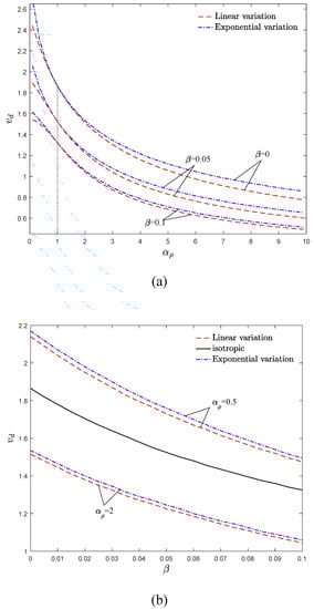 To better describe the dynamic behavior of AFG moving beams, the stability maps in vd–αρ and vd–β planes are plotted in Figure 8a,b, respectively. As demonstrated in Figure 8a, the AFG moving beam is more stable for αρ < 1 in comparison with the isotropic one. It is crucial to mention that the stability borders of exponential and linear distributions approach to each other for the density gradient parameters close to one (i.e., the isotropic case). Moreover, the critical velocity of the structure is higher for the exponential distribution of density in comparison with the linear one, especially for the higher and lower values of αρ. In other words, the difference between the stability borders of linear and exponential distributions can be magnified by selecting a higher or lower density gradient.
