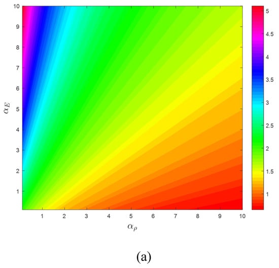 According to previous sections, it can be concluded that the variations of elastic modulus and density along the axial direction of the structure have remarkable effects on the vibrations of axially moving beams. Additionally, it is demonstrated that mitigating the excessive oscillations is feasible by adjusting αE and αρ, separately. Based on Figure 4, Figure 5, Figure 6, Figure 7 and Figure 8, variations of elastic modulus and density along the longitudinal direction of the beam have opposite effects on the stability of the system. As a result, these parameters can provide additional degrees of freedom to modify the dynamic characteristics of axially moving structures. In other words, it is possible to significantly improve the performance of axially moving systems by simultaneous fine-tuning αE and αρ. Therefore, determining the role of simultaneous gradation of the material properties on the stability of the moving structures is of great significance. In this section, stability characteristics of the system are explored by considering the coupled variation of density and elastic modulus through the axial direction (simultaneous mass-addition and stiffness-hardening effects). Additionally, the exact analytical expression is presented for critical divergence velocity. Furthermore, a comparison is carried out between different solution procedures.