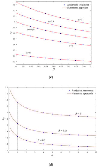 In Figure 10a–d), the instability thresholds of the system when the elastic modulus and density gradient parameters are equal (αE = αρ = α) are demonstrated, and the validity of the analytical expressions are examined. According to these figures, the critical divergence velocities acquired by the numerical approaches are in a close agreement with those acquired analytically. As seen in Figure 10a, increasing the material gradient parameter, α, leads to a slight decrease in the critical divergence velocity of the structure. Therefore, compared with the stability maps in previous sections (Figure 6 and Figure 8), it can be inferred that the density gradation (mass-addition effect) shows a dominant role in the stability of the system, and elastic modulus gradation (stiffness-hardening effect) has less effect on the vibrational behavior of the structure. It should be mentioned that compared with previous sections, as density and elastic modulus vary simultaneously, stability borders are closer to each other and are less sensitive to the axial material gradation when the effect of flexural stiffness is highlighted. According to Figure 10b, the stability regions of the system shrink by increasing the gradient parameter, and the curves have a descending trend. Moreover, in the higher values of dimensionless flexural stiffness, variation in the gradient parameter has a minor influence on the instability threshold of AFG moving beam; this point can be helpful at the design stage. As depicted in Figure 10c,d, the stability regions shrink by increasing the gradient parameter and rotary inertia factor. Compared with the isotropic case, when α < 1, the axially moving beam is more stable. Furthermore, at sufficiently high gradient parameter, the divergence velocity of the structure experiences small changes.