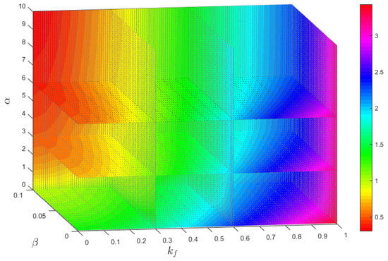 The critical velocity of the system in the three-dimensional space of α, β, and kf is plotted in Figure 11. It is detected that the instability threshold of moving beams is entirely dependent on the axial material gradation, dimensionless flexural stiffness, and rotary inertia factor. As it is obvious, the variation of the material gradient parameter and the rotary inertia factor have the same effects on the stability boundaries, and by increasing each of these parameters, the divergence strength of the system diminishes. While ascending the flexural stiffness enhances the stability of the structure. Consequently, in the simultaneous presence of higher values of dimensionless flexural stiffness, lower values of the material gradient, and rotary inertia factor, the performance of axially moving systems would be improved. Therefore, these parameters could be introduced as the key factors for the vibration control of moving continua. Generally, AFG moving beams are more flexible to adjust their vibrational behavior in comparison with isotropic ones. As a result, it can be claimed that, compared with isotropic materials, AFG ones have a better performance in axially moving structures.