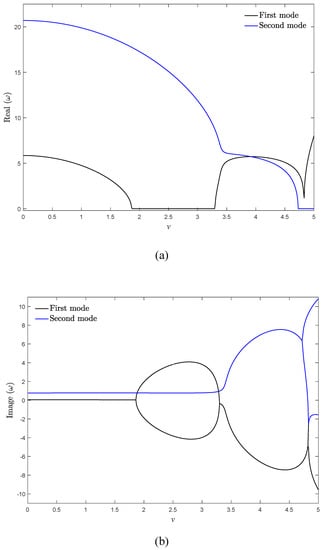 (a) Real and (b) imaginary parts of two vibrational frequencies of a viscoelastic moving beam for kf = 0.5, αE = αρ = 1, β = 0, μ = 0.001.