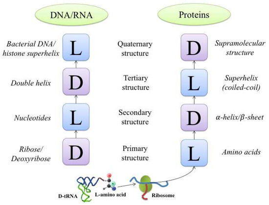A schematic presentation showing the sequence of alternating types of chiral structures with alternating chirality signs starting from the primary structure up to the level of quaternary structure organization for DNA (or RNA, left column) and proteins (right column). L, left configuration of enantiomer or helix; D, right configuration of enantiomer or helix.