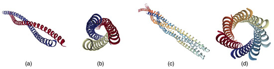 Protein structures containing left-handed coiled-coils: (a) PDB ID: 1D7M [23] (based on two right-handed α-helices), (b) PDB ID: 1WT6 [24] (based on three right-handed α-helices), (c) PDB ID: 1QU7 [25] (based on four right-handed α-helices), and (d) PDB ID: 2HY6 [26] (based on seven right-handed α-helices) [27].