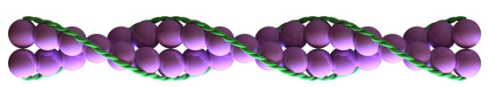 Tropomyosin left-handed coiled-coil (green) twists on the F-actin right-handed double helix (purple) in the right-handed direction.