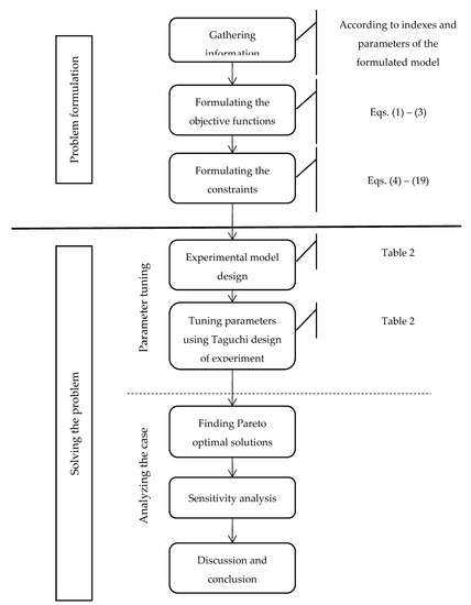Based on the SC structure shown in Figure 1, the problem is formulated as a multi-objective optimization model. The list of indices, parameters and decision variables of the model are presented in this section. This proposed model is based upon the work of Feito Cespon et al. 2017 [22] by using different objective functions, and case study and solving approaches, to compare the results.