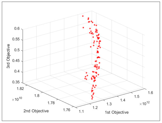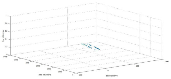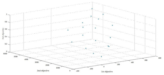 As stated above, since the size of the case study is high and the GAMS software is not able to solve it at an acceptable time, the original model in the MATLAB software is solved based on the NSGA-II algorithm, the Pareto points from which are presented in Table 14 and Figure 6.