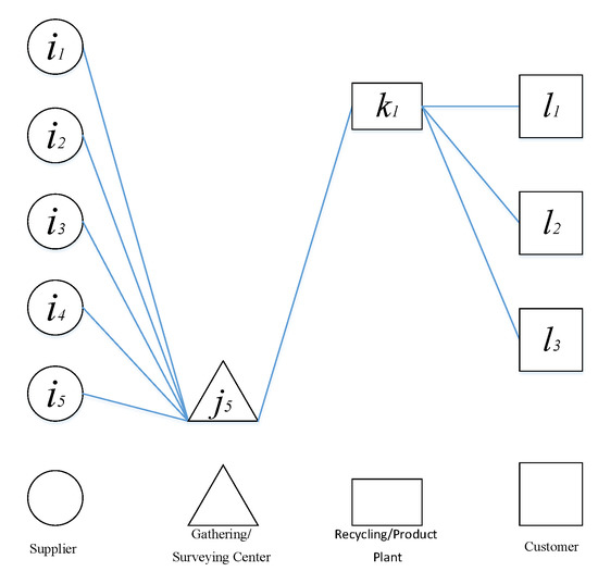 As expected, due to the high cost of constructing facilities in the steel industry, one center (center number 5) of the five candidates was selected, and one factory (factory number 1) of the three nominated recycling/production plants for construction is calculated, and it provides an excellent answer to the case study. In this way, the schematic of the reverse SC model is changed after the solution, as shown in Figure 6.
